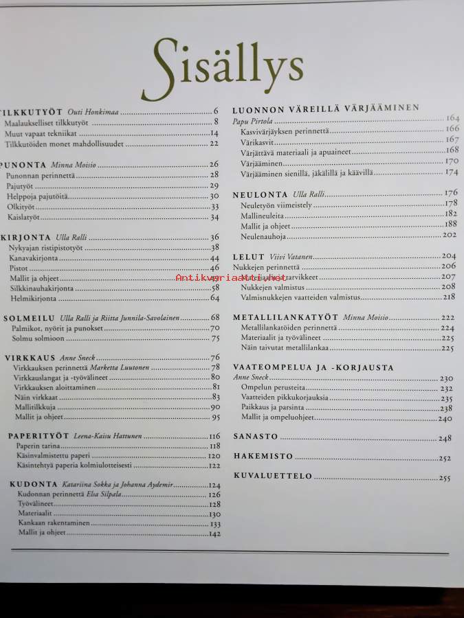 Tilkkutyöt, punonta, kirjonta, solmeilu, virkkaus, paperityöt, kudonta, luonnon väreillä värjääminen, neulonta, lelut, metallilankatyöt, vaateompelua ja -korjausta, sisällysluettelo kuvissa