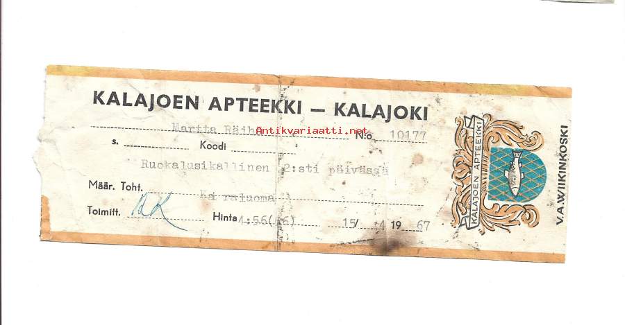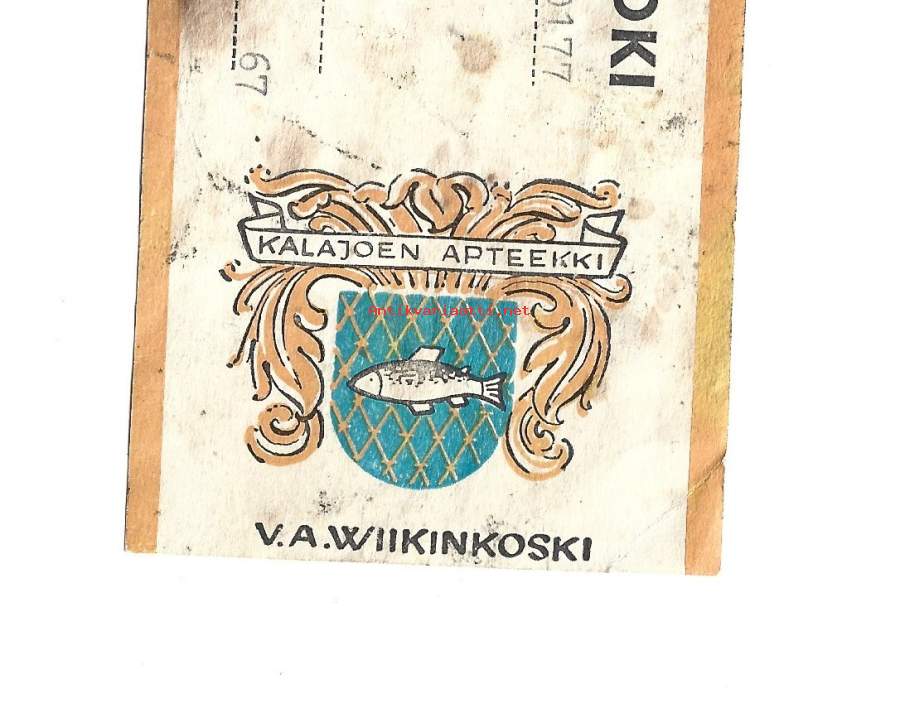Kalajoen Apteekki V A Wiikinkoski - resepti signatuuri 1967