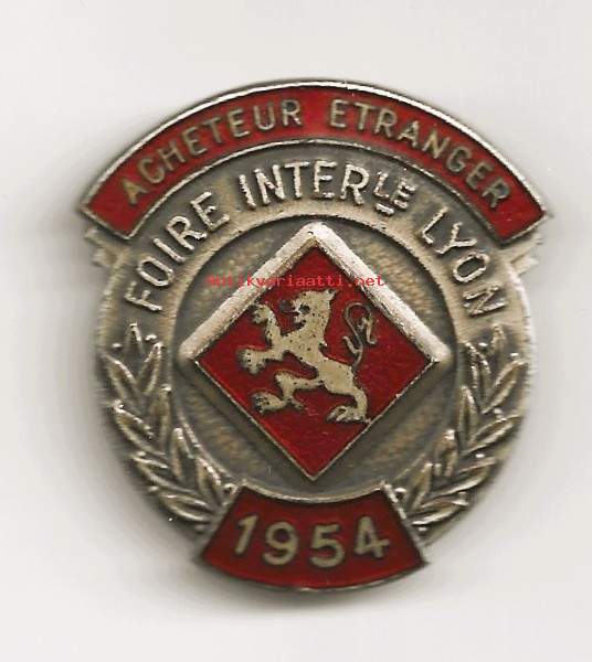 Lyonin kansainvälisten messujen (Foire Internationale de Lyon) ulkomaiselle ostajalle tarkoitettu rintamerkki vuodelta 1954. lukkoneulamerkki rintamerkki