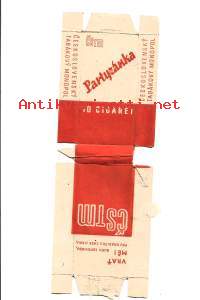 vanha tšekkoslovakialainen "Partyzánka" -merkkisten savukkeiden pakkaus, joka on peräisin Tšekkoslovakian tupakkamonopolin ajalta (ČSTM).Tuote: 10 kappaleen Partyzánka-savukerasia.Alkuperä: Tšekkoslovakia, Tupakkamonopoli.Teksti: Pakkauksessa on tšekinkielinen ympäristöteksti "VRAŤ MĚ! BUDU SUROVINOU, PRO KRABIČKU ZASE JINOU", joka kehottaa palauttamaan rasian uusiokäyttöön.KäännösVRAŤ MĚ!: Palauta minut!BUDU SUROVINOU, PRO KRABIČKU ZASE JINOU: Minusta tulee raaka-ainetta toista rasiaa varten.10 CIGARET: 10 savuketta.ČESKOSLOVENSKÝ TABÁKOVÝ MONOPOL: Tšekkoslovakian tupakkamonopoli.Partyzánka: Partisaani (tuotemerkki).