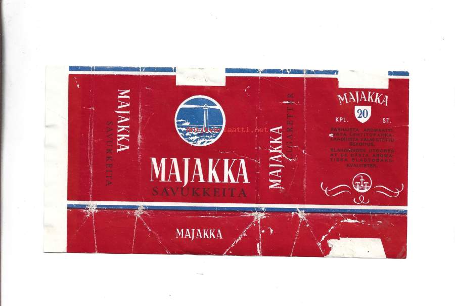 Majakka / Tampereen Tupakkatehdas 1950 - tupakkaetiketti, saumoista avattu tupakka-aski