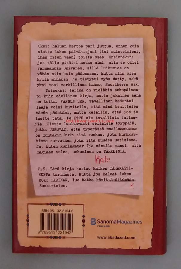 Fantasiaseikkailun toinen osa, jossa Kate jatkaa matkaansa maagisessa Abadazadin maailmassa etsiäkseen veljeään Mattia. Kuvitettu sarjakuvanomaisesti. Dimensiot 21 ¤ 13 cm.