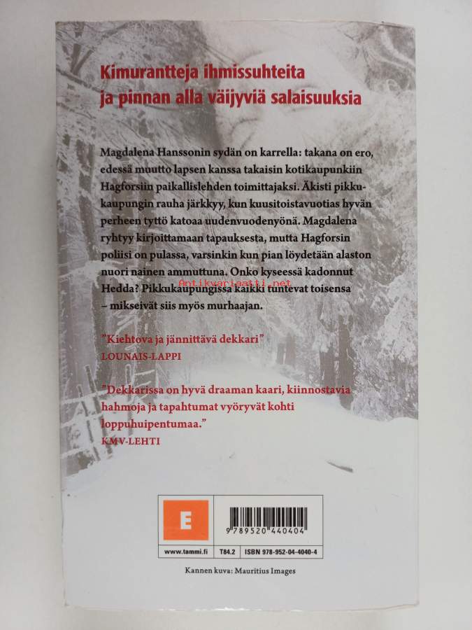 Muu(t) tekijä(t): Maija KauhanenSarja: Hagfors-sarja [1Alkuteos: Flickan med snö i håretAsiasanat: murha, toimittajat, nuoret, tytöt, katoaminen, pikkukaupungit