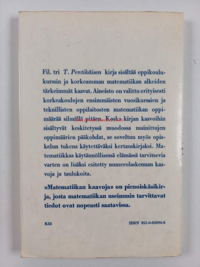Koko nimi: Matematiikan kaavoja : algebra, geometria, trigonometria, analyyttinen geometria, differentiaali- ja integraalilaskenta, vektori- ja matriisilaskenta, todennäköisyyslaskentaMerkinnät: omistajamerkintä