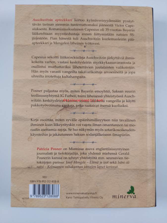 Muu(t) tekijä(t): Niko JääskeläinenAlkuteos: The pharmacist of AuschwitzAsiasanat: historia, toinen maailmansota, lääkkeet, juutalaiset, keskitysleirit, joukkotuho, holokausti, oikeudenkäynti, yhteistyö, kemianteollisuus, natsit, testaus, sotarikokset, lääketieteelliset kokeet, Auschwitz, ihmiskokeet, sotarikolliset, proviisorit