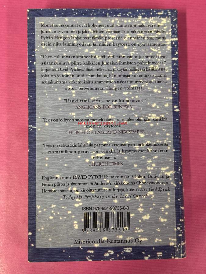Monet seurakunnat ovat kokeneet uudistumisen ja haluavat tuntea Jumalan syvemmin ja jakaa hänen voimaansa ja rakkauttaan toisille. Pyhän hengen lahjat ovat tämän prosesstin olennainen osa, mutta usein niitä laiminlyödään tai niiden käytössä on epävarmuutta. "Olen tullut vakuuttuneeksi siitä, että tunnusteot ja ihmeet ovat asiaankuuluva piirre kaikkien Jumalan ihmisten palvelutyössä", kirjoittaa David Pytches. Tässä sekeässä ja käytännöllisessä käsikirjassa, joka on jo toinen, uudistettu laitos, hän omista kokemuksistaan ja seurakuntansa kokemuksista ammentaen tarjoaa suuntaviivoja, kuinka oppia palvelemaan Hengen voimassa.