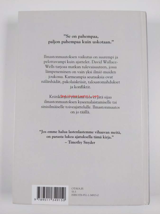 Muu(t) tekijä(t): Jani Kaaro, Tarja KontroAlkuteos: The uninhabitable earthAsiasanat: maapallo, ilmastonmuutokset, ilmasto, uhkakuvat, maailmanlaajuiset ongelmat, lämpeneminen, yhteiskunnalliset vaikutukset, kasvihuoneilmiö, ympäristönmuutokset, ihmisen ekologia, ekokatastrofit