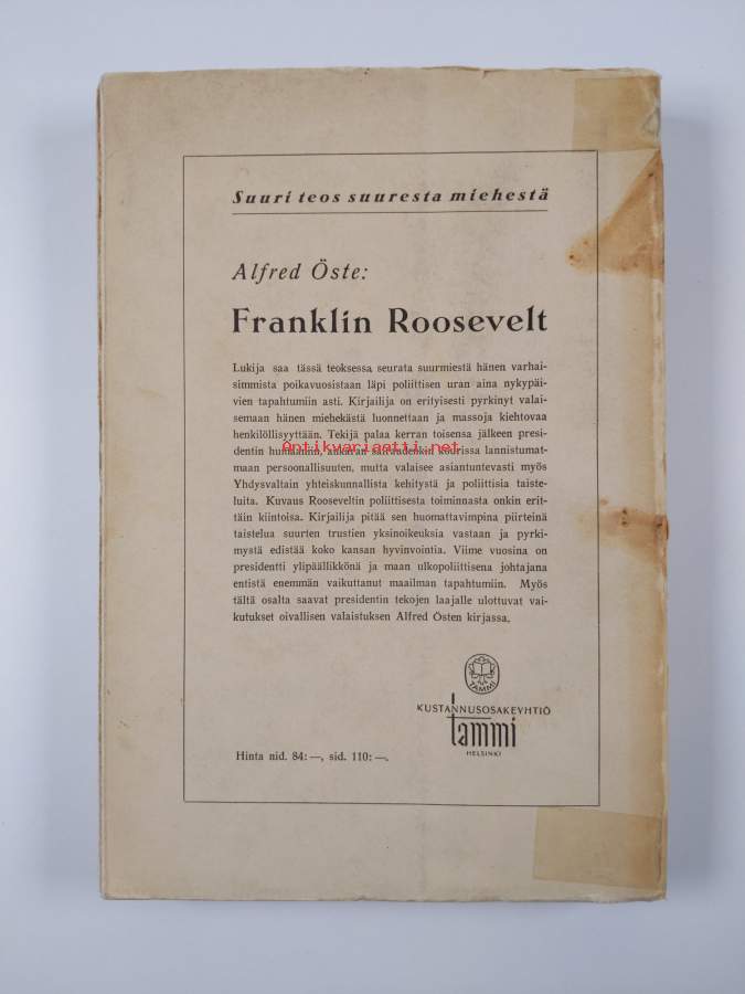 Tyydyttävä. Pientä tahraisuutta, pientä kulumaa. selkämystä teipattu