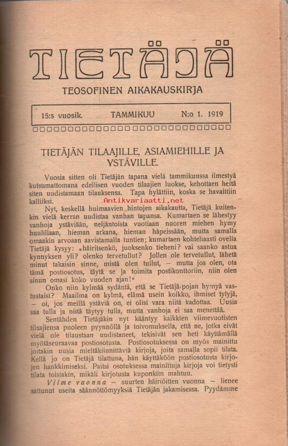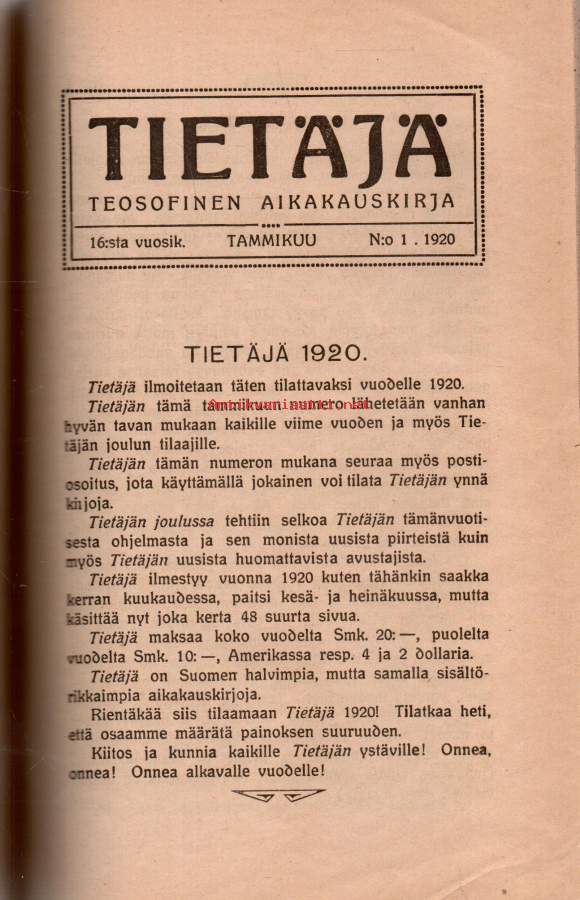 Tietäjä -Teosofinen aikakauskirja 1-12 1919 sekä 1-10 1920