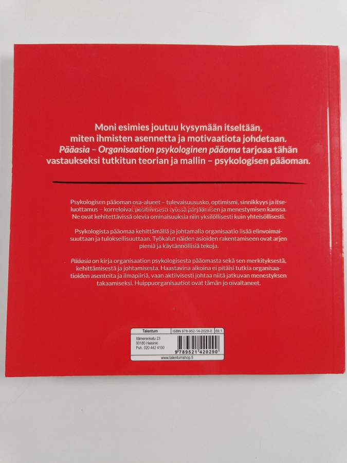 Muu(t) tekijä(t): Makke Leppänen, Annamari HeikkiläAsiasanat: psykologia, johtaminen, kehittäminen, muutos, asenteet, optimismi, itseluottamus, vuorovaikutus, henkilöstöjohtaminen, organisaatiot, tunneäly, tulevaisuudenodotukset, organisaatiopsykologia, organisaatiokulttuuri, organisaatiokäyttäytyminen, esimiestyö, henkinen pääoma, tiimit, psykologiset tekijät, yhteishenki