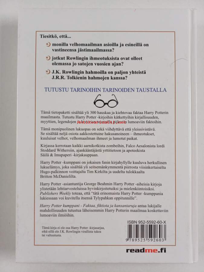 Muu(t) tekijä(t): Sini BonkeAlkuteos: Fact, fiction, and folklore in Harry Potter's worldAsiasanat: lastenkirjallisuus, kaunokirjallisuus, hakuteokset, fantasiakirjallisuus