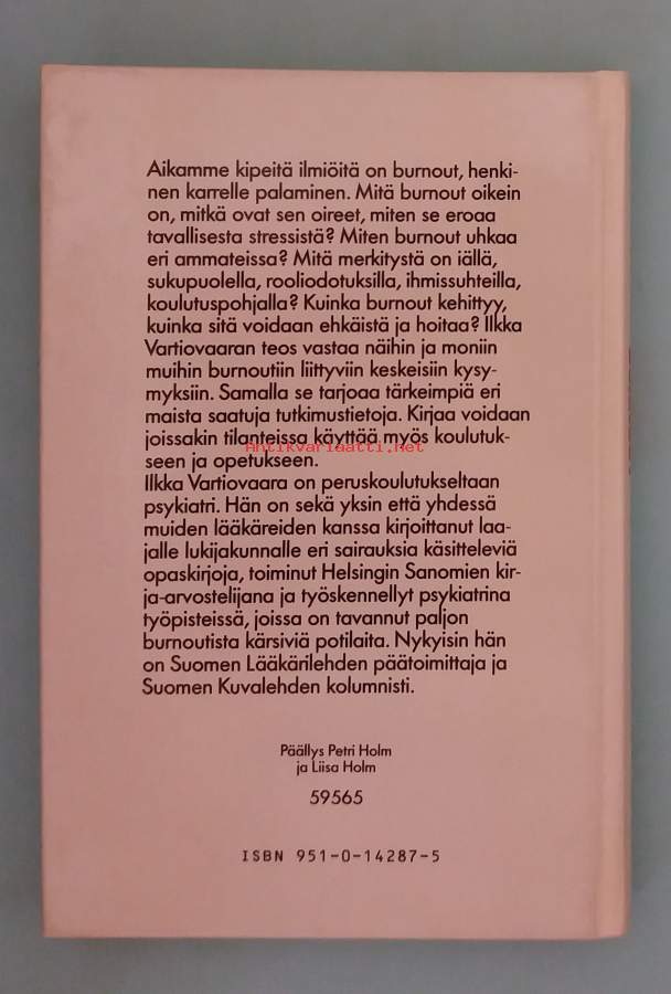 Kirja selittää, mitä burnout on, miten se eroaa tavallisesta stressistä ja millaisia oireita siihen liittyy sekä tarjoaa ymmärrettävän kokonaiskuvan henkisestä uupumisesta sekä sen ehkäisystä ja hoidosta. Dimensiot 20 ¤ 14 cm.
