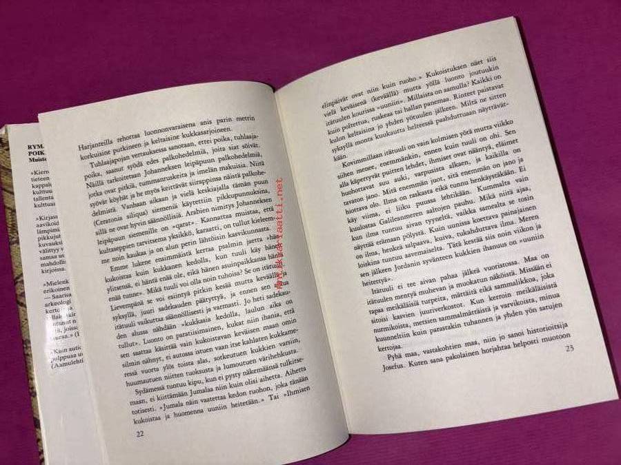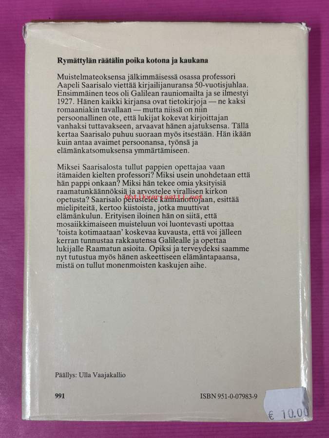 Muistelmateoksensa jälkimmäisessä osassa professori Aapeli Saarisalo viettää kirjailijanuransa 50-vuotisjuhlaa.Miksei Saarisalosta tullut pappien opettajaa vaan itämaiden kielten professori? 'miksi usein unohdetaan että hän pappi onkaan? Miksi hän tekee omia yksityisiä raamatunkäännöksiä ja arvostelee virallisen kirkon opetusta? Saarisalo perustelee kannanottojaan, esittää mielipiteitä, kertoo kiistoista, jotka muuttivat elämänkulun. Erityisen iloinen hän on siitä että mosaiikkimaiseen muisteluun voi luontevasti upottaa 'toista kotimaataan' koskevaa kuvausta, että voi jälleen kerran tunnustaa rakkautensa Galilealle ja opettaa lukijalle Raamatun asiota. Opiksi ja terveydeksi saamme nyt tutustua myös hänen askeettiseen elämäntapaansa, mistä on tullut monenmoisten kaskujen aihe.