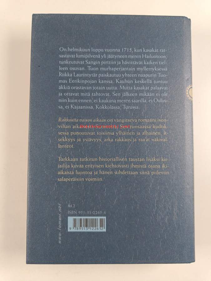 Hyvä. Pienoista kulumaa kansissa, pienoista kolhua selkämyksen päissä, selkämyksessä hieman vinoutta. Kansipaperin kunto: pientä kulumaa reunoilla