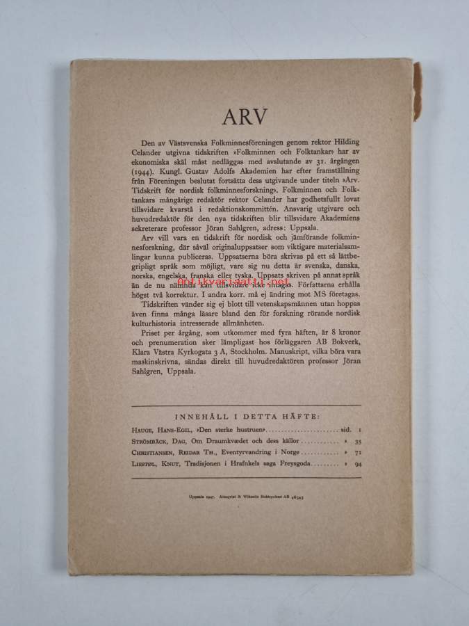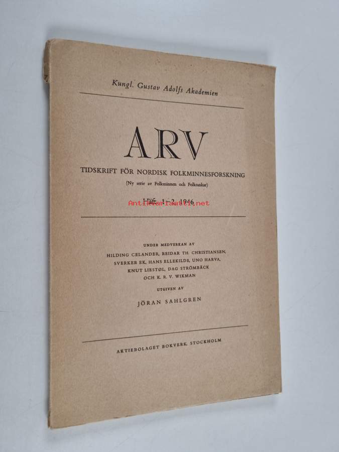 Koko nimi: Arv. Tidskrift för Nordisk Folkminnesforskning. (Ny serie av Folkminnen och Folktankar) Häft. 1-2, 1946 Under medverkan av Hilding Celander, Reidar Th. Christiansen, Sverker Ek, Hans Ellekilde, Uno Harva, Knut Liestøl, Dag Strömbäck och K. R. V. Wikman USarja: Arv. Tidskrift för Nordisk Folkminnesforskning Häft. 1-2, 1946 [årg. 2Asiasanat: folktradition, folkloristik