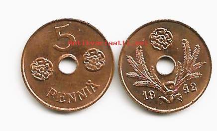 5 penniä 1942 Cu sota-ajan kolikko