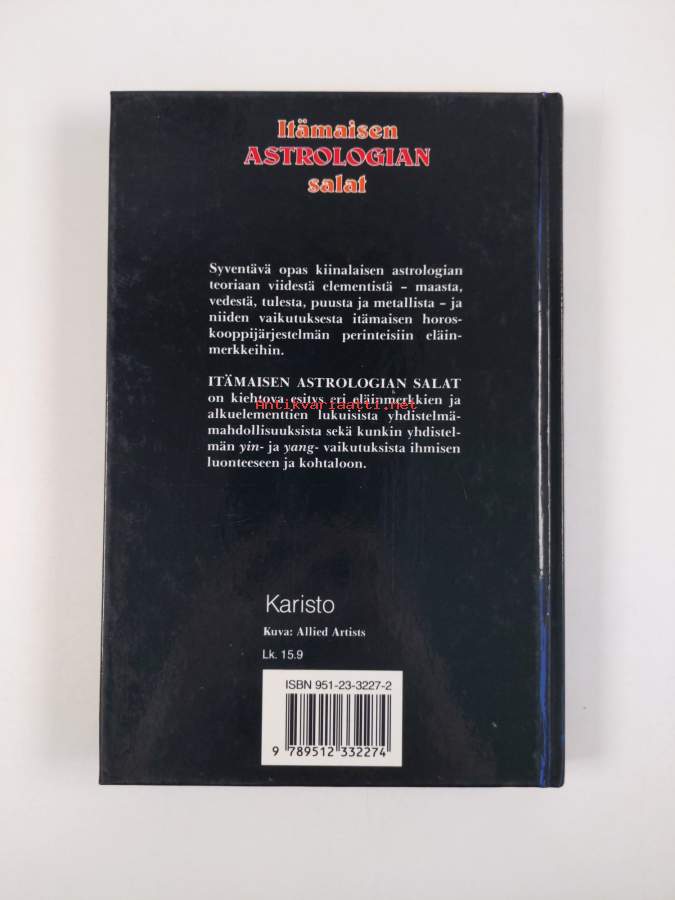 Koko nimi: Itämaisen astrologian salat : opas kiinalaiseen teoriaan viidestä elementistä, maasta, tulesta, vedestä, puusta ja metallista, ja siitä, kuinka ne vaikuttavat astrologiaanMuu(t) tekijä(t): Eero Mänttäri, Teresa KennedyMerkinnät: omistajamerkintäAlkuteos: Chinese elemental astrologyAsiasanat: astrologia, horoskoopit