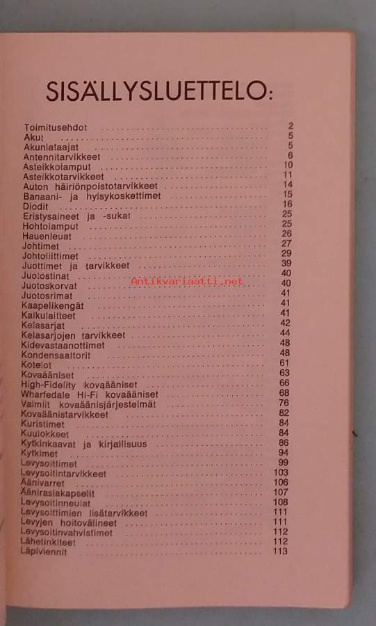 Tarjolla lähes 60 vuotta vanha kuvitettu radiotarvikeluettelo. Dimensiot17 ¤ 11 cm. Sisältö virheetön. Kaikki 18 kpl elektroniikkaluetteloita yhteishintaan 200,00 euroa.