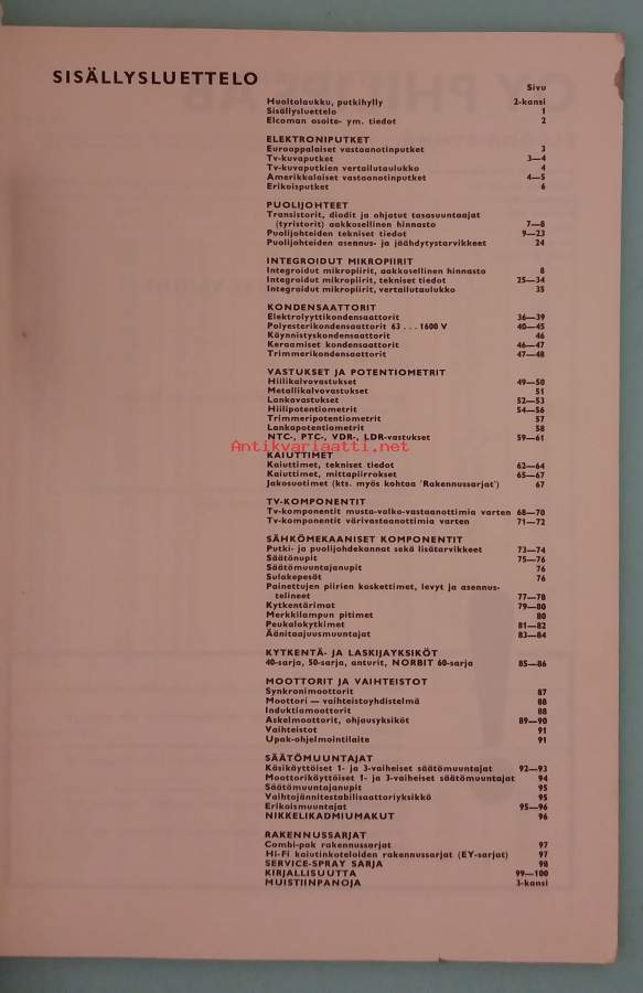 Yli 50 vuotta vanha kuvitettu Philipsin komponenttiluettelo v. 1971-1972. Kansissa kulumaa, mutta sisältö virheetön. Dimensiot 30 ¤ 21 cm. Kaikki 18 kpl elektroniikkaluetteloita yhteishintaan 200,00 euroa.