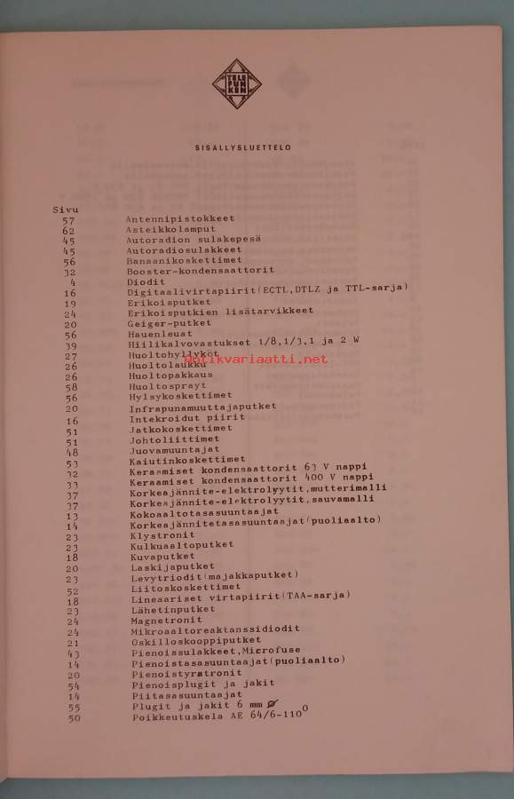 Tarjolla yli 50 vuotta vanha osin kuvitettu hinnastoluettelo. Kansissa kulumaa, mutta sisältö virheetön. Dimensiot 30 ¤ 22 cm. Kaikki 18 kpl elektroniikkaluetteloita yhteishintaan 200,00 euroa
