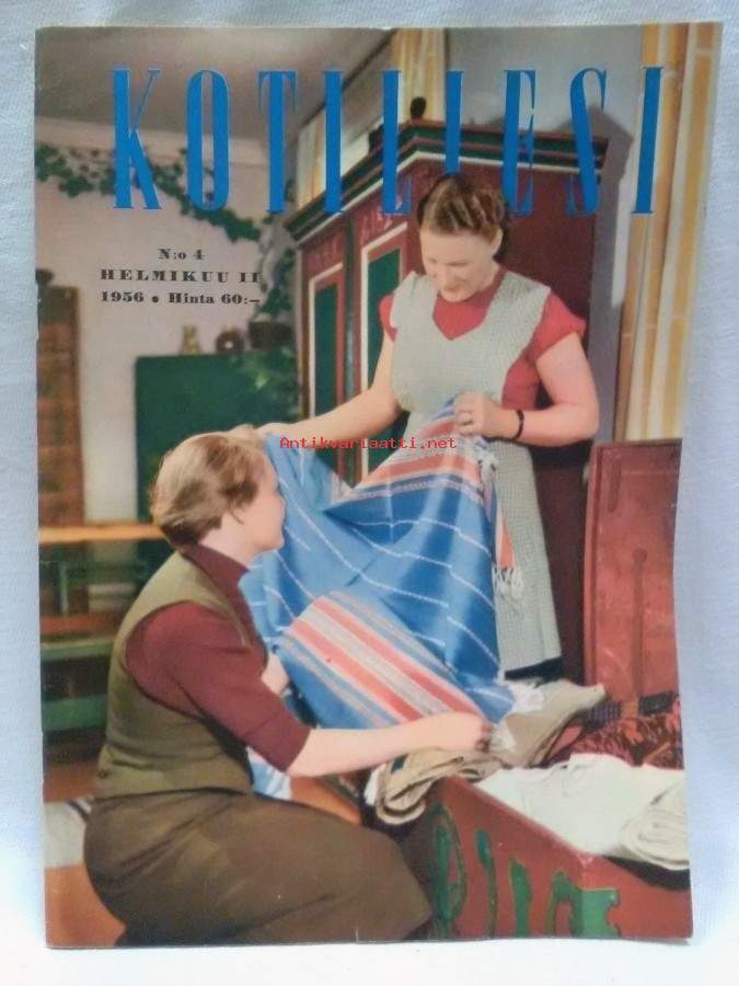 Ilmestynyt 23.2.1956,72s., sisällysluettelo kuvassa,sisällys mm. Kotilieden kiikarista,Kotilieden käsityövakka,Loma-ajatuksia täältä torpasta,Näin minä teen,Silakkahuopukas,Päivänsininen tarina alkaa,Onko kopalla, kipolla, kauhalla tulevaisuutta?,Ostajalla on oikeus,Hakasalmen huvilan nykyinen emäntä Helmi Helminen,Konsertissa,Kalossit,Rivitalo - omakotitalon edut - kerrostalon kustannukset,Kuka vastaa nelosista?,Pienten koriste-esineiden paikka,Pirttimme on iloa täynnä, kun tuli Kummikerhon paketti,Keinutuolin syliin,Neuvo niisiin. Kudonta-aiheinen väriliite,Sievä tyyny sohvannurkkaan,Rakastan ruusuja, mutta sopivatko ne mminulle?,Älä ole kateellinen,Vauvan ensi varusteet valtion lahjana,Vaavan ensi varusteita,Helpolla ja halvalla lisää komerotilaa,Jurrikka,Kananpaistia pyhäisin, jatkokertomus,132 markan ruokapöytä,Maukas Matinpäiville,Matka Kööpenhaminaan,(Hossola)