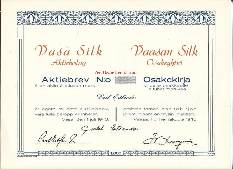 Vasa Silk-Vaasan Silkki Oy, 1000 mk osakekirja, Vaasa 1.7.1943
