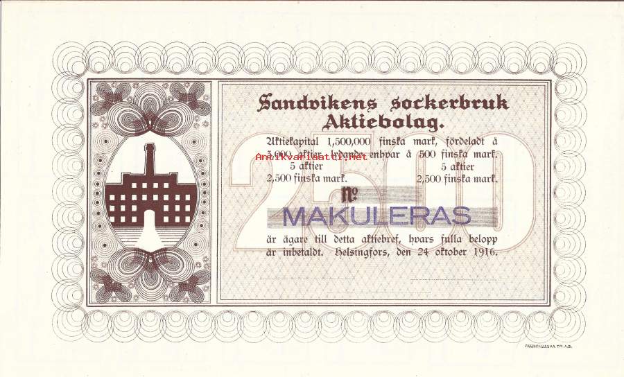 Sandvikens Sockerbruk Ab, Helsinki 1916, 500 mk -osakekirja