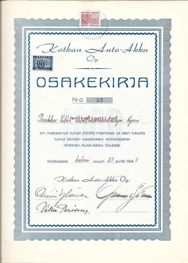 Kotkan Auto-Akku Oy, Kotka 1944 osakekirja