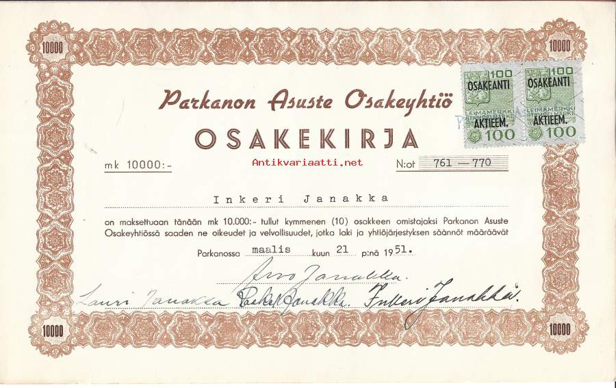 Parkanon Asuste Oy, Parkano 1951 -osakekirja