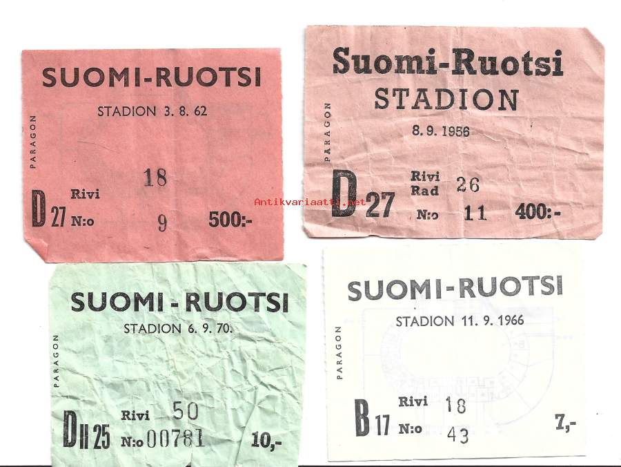 Suomi - Ruotsi maaottelu Stadion pääsylippu1956,1962,1966 ja 1970 yht 4 kpl