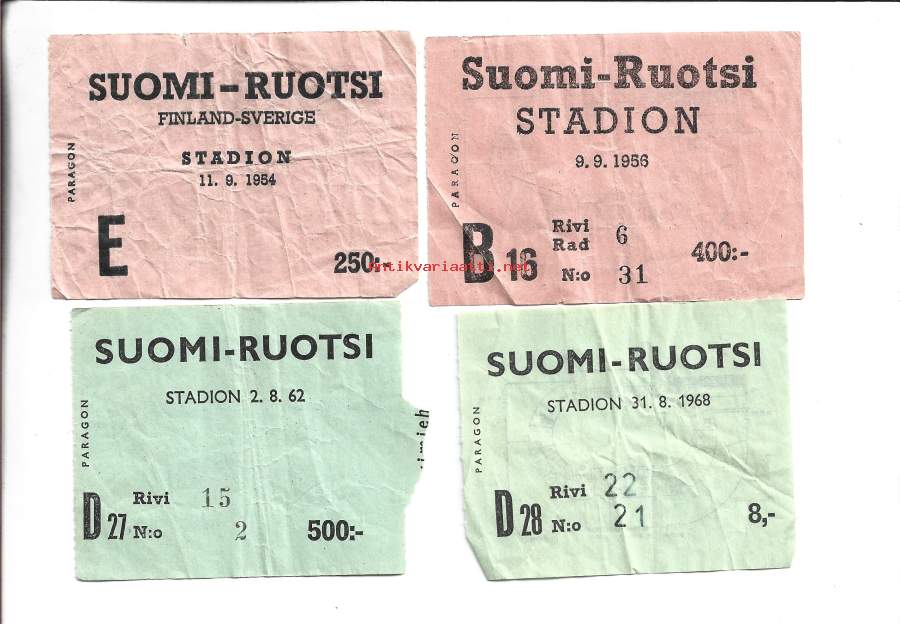 Suomi - Ruotsi maaottelu Stadion pääsylippu1954,1956,1962 ja 1968 yht 4 kpl