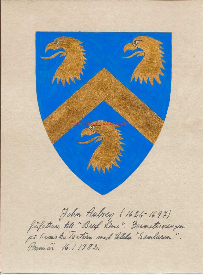 John Aulrey sukuvaakuna alkuperäinen guassimaalaus pahville 25x19 cm