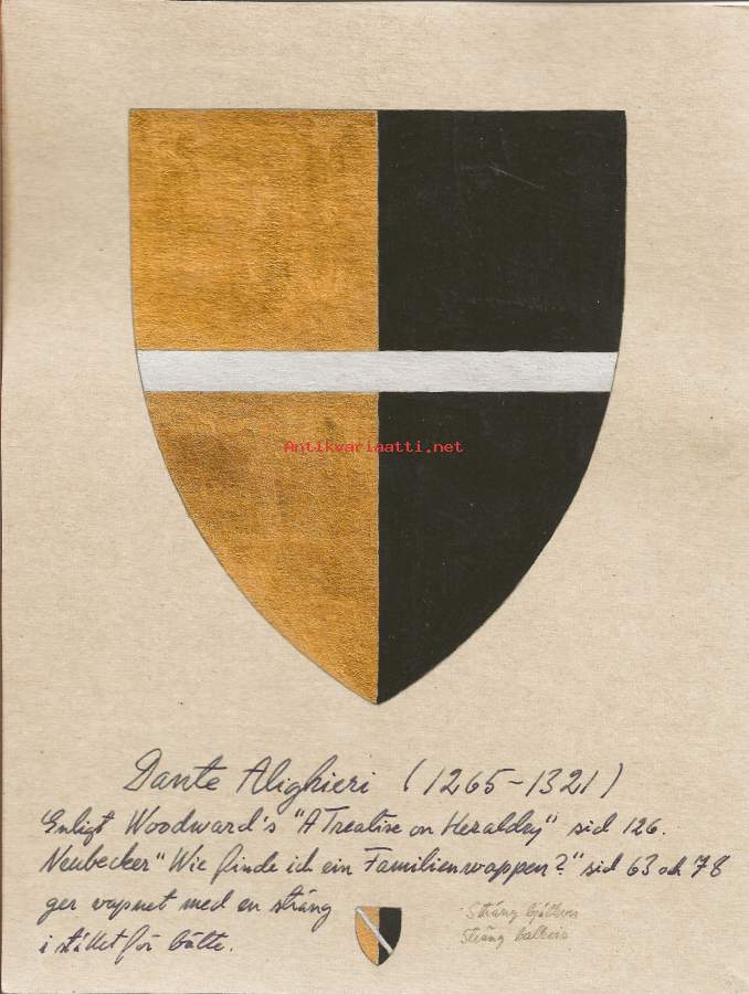 Dante Alighieresukuvaakuna alkuperäinen guassimaalaus pahville 22x16 cm
