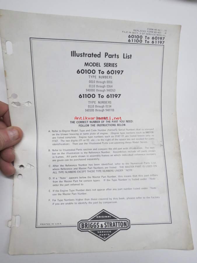 Briggs & Stratton Illustrated Parts List Model Series 60100 to 60197 / 61100 to 61197
