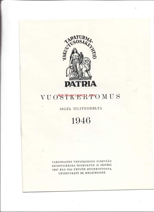 Tapaturma-Vakuutus Oy Patria vuosikertomus vuodelta 1946