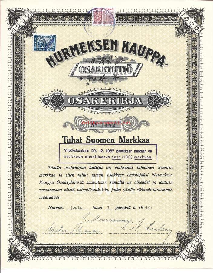 Nurmeksen Kauppaosakeyhtiö, Nurmes 1.12.1942, 1 000 mk, nr 1932 -osakekirja / share certificate