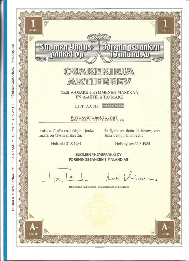 Suomen Yhdyspankki Oy 1984 osakekirja, Helsinki