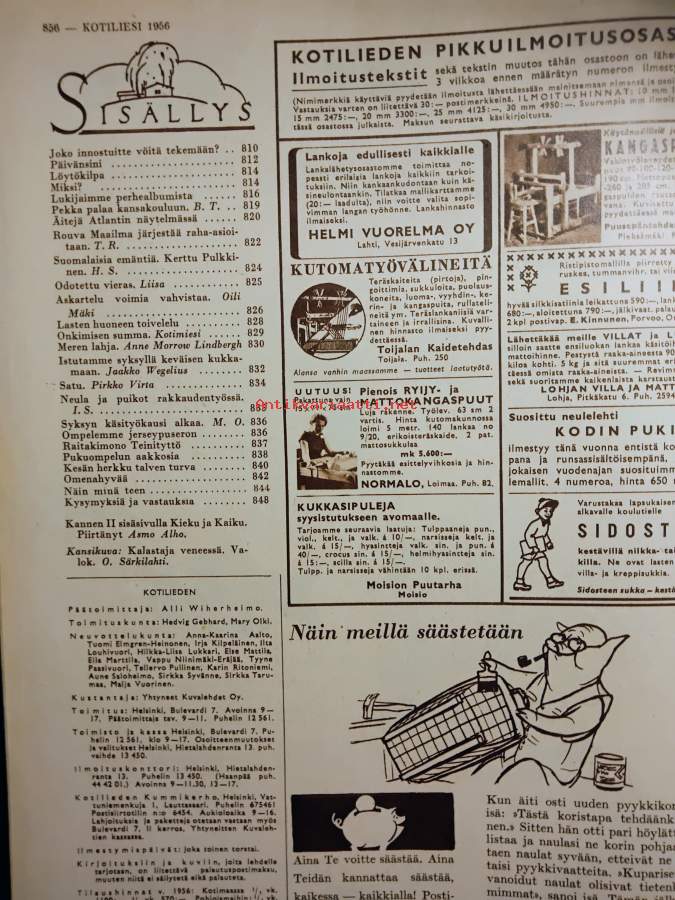 Ilmestynyt 23.8.1956, 48s., sisällysluettelo kuvassa,sisällys mm. Joko innostuitte vöitä tekemään?,Päivänsini,Löytökilpa,Miksi?,Pekka palaa kansakouluun,Äitejä Atlantin näytelmässä,Rouva Maailma järjestää raha-asioitaan,Suomalaisia emäntiä: Kerttu Pulkkinen,Odotettu vieras,Askartelu voimia vahvistaa,Lasten huoneen toivelelu,Onkimisen summa,Meren lahja,Istutamme syksyllä keväisen kukkamaan,Satu,Neula ja puikot rakkaudentyössä,Syksyn käsityökausi alkaa,Ompelemme jerseypuseron,Raitakimono Teinitytölle,Pukuompelun aakkosia,Kesän herkku talven turva,Omenahyvää,Näin minä teen