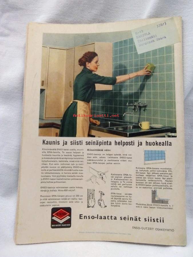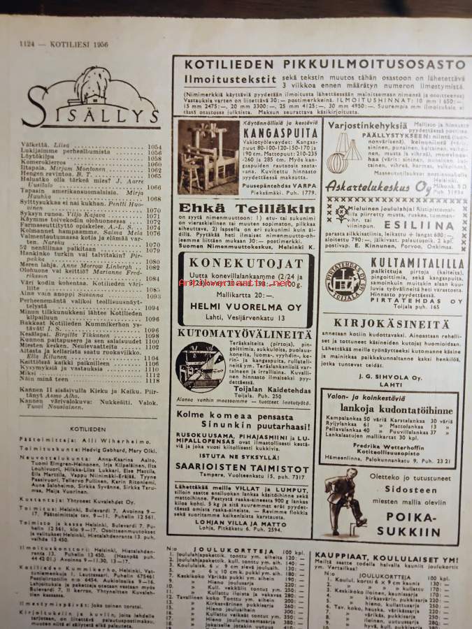 Ilmestynyt 18.10.1956, 72s., sisällysluettelo kuvassa,sisällys mm. Aitasta ja Kellarista saatu ruokaviikko,Kunnon paitapusero kaava,Perheenemäntä valikoi teollisuusnäyttelyssä,Turkki vai talvitakki,Tapasin Amerikansuomalaisia