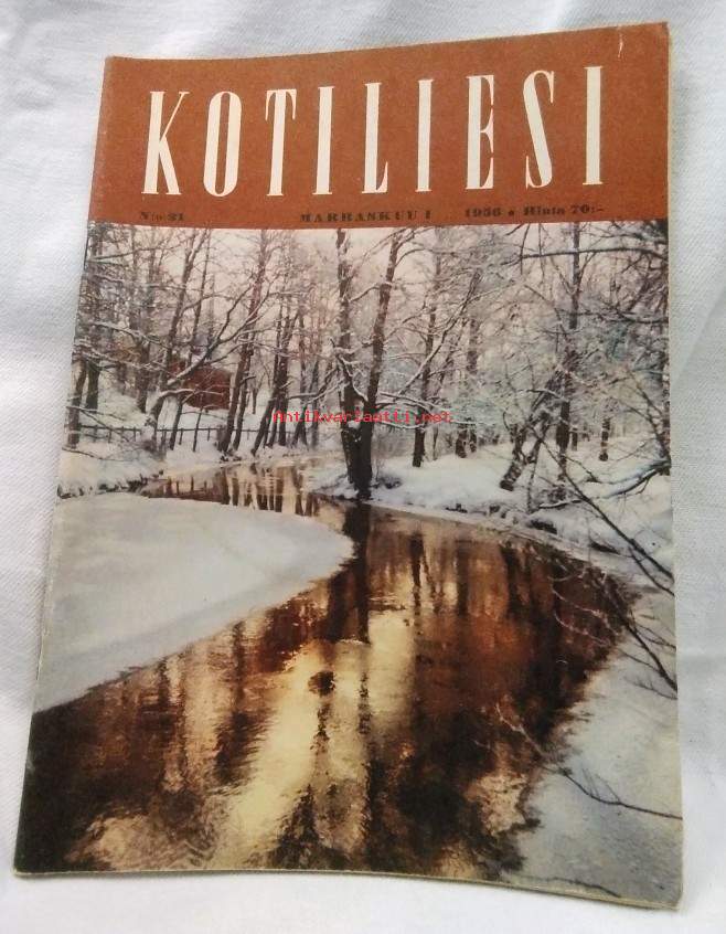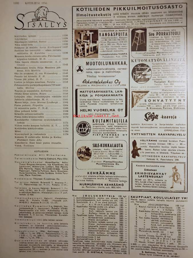 Ilmestynyt 1.11.1956, 68s., sisällysluettelo kuvassa,sisällys mm. Kotilieden kiikari,Sikaämpäri kädessä,Näin minä teen,Rakkaus ja muisto,Raittius luo terveyttä - oikea ravinto raittiutta,Menneen kesän sininen satu. Päivänsinikilpailun tulokset,Näin lapsen elämän sammuvan,Maakunnan koulu Hilja Massisen Massinen johdossa,Ota ilo avuksesi,Puusta vai kivestä,Vieras jää yöksi,Lasten ja lelujen maailma,Pehmustettu putkijalkajakkara 700 markalla,Napoja ja nappuloita,Ollako hieno nainen,Lahjojen aika, joululahjojen väriliite,Juhlavia pikkuliinoja,Meren lahja,Paras pukuni,10 minuutin paita silittäminen,Illan pehmeä hetki,Sirkeille seitsenvuotiaille,Pikku äidin kirjeenvaihto,Kauhakerho valmistaa syntymäpäiväkakun,Viikon ruoka kaupan hyllyltä,Kotilieden käsityövakka