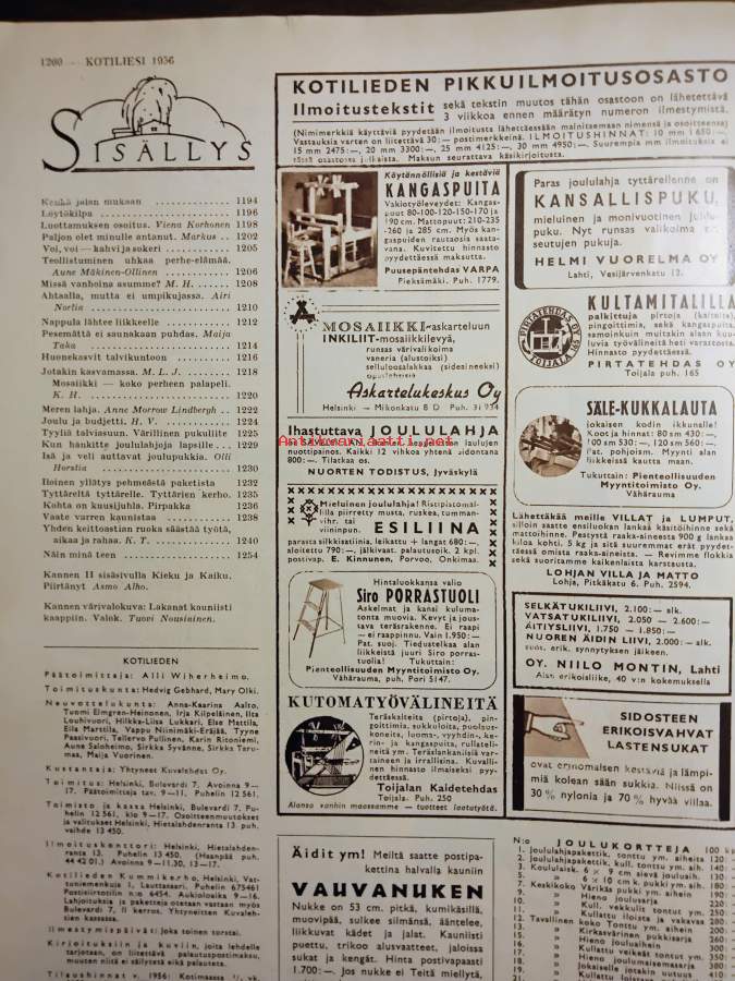 Ilmestynyt 15.11.1956, 68s., sisällysluettelo kuvassa,sisällys mm. Kenkä jalan mukaan,Luottamuksen osoitus,Paljon olet minulle antanut,Voi, voi - kahvi ja sokeri,Teollistuminen uhkaa perhe-elämää,Missä vanhoina asumme?,Ahtaalla, mutta ei umpikujassa,Nappula lähtee liikkeelle,Pesemättä ei saunakaan puhdas,Huonekasvit talvikuntoon,Jotakin kasvamassa,Mosaiikki - koko perheen palapeli,Meren lahja,Joulu ja budjetti,Tyyliä talviasuun. Värillinen pukuliite,Kun hankitte joululahjoja lapsille,Isä ja veli auttavat joulupukkia,Iloinen yllätys pehmeässä paketissa,Tyttäreltä tyttärelle,Kohta on kuusijuhla,Vaate varren kaunistaa,Yhden keittoastian ruoka säästää työtä, aikaa ja rahaa