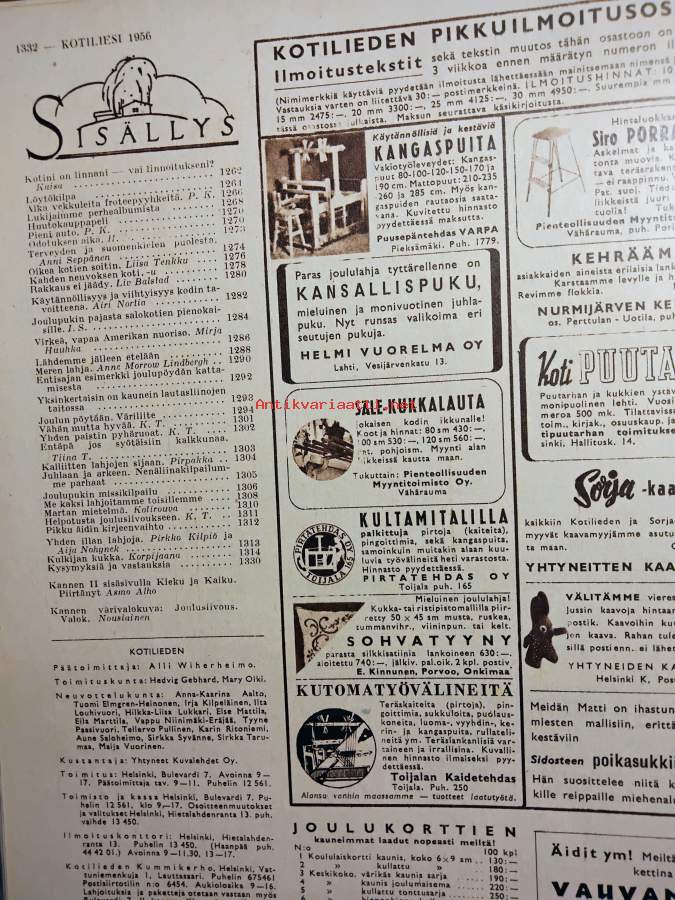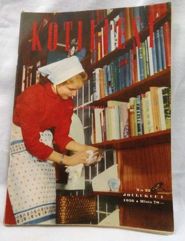 Ilmestynyt 1.12.1956, 64s., sisällysluettelo kuvassa,sisällys mm. joulusiivous,esimerkki joulunpöydän kattamisesta,vapaa Amerikan nuoriso,hallintoneuvos Lemmikki Kekomäki ja oikeusneuvos Esko Kekomäki,Anni Seppänen Terveyden ja suomenkielen puolesta,Jouluvehnänen,Joulutorttu