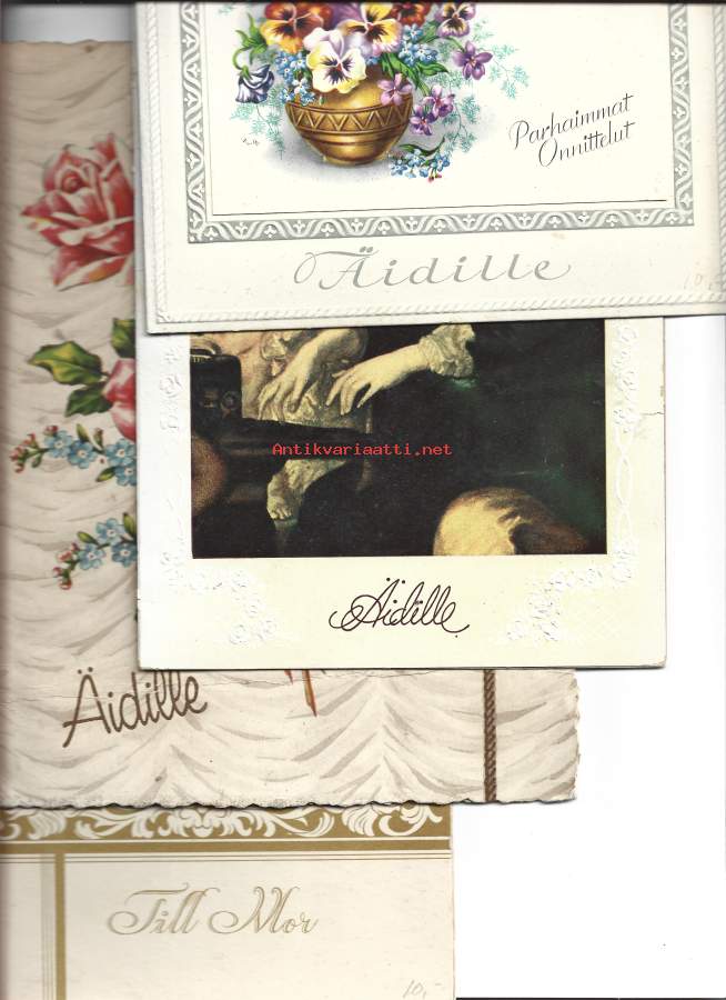 Äitienpäiväkortti erä 1940-60 luvuilta 3 kpl erä - äitienpäiväkortti, onnittelukortti, taittokortti, postikortti