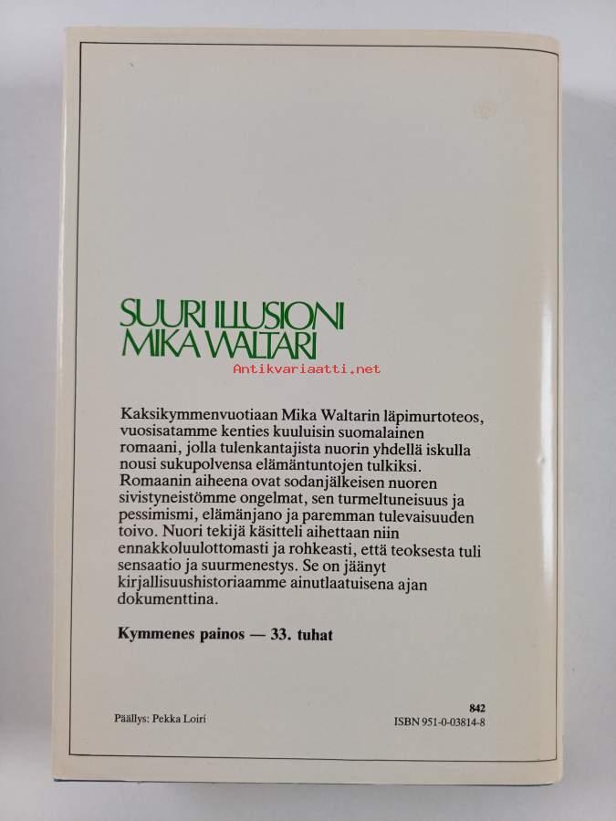 Hyvä. Tarkempi kuntoluokka: K3+ ; Pienoista kulumaa kansissa, selkämyksessä aavistus vinoutta. Kansipaperin kunto: jonkin verran kulumaa/pienoisia repeämiä