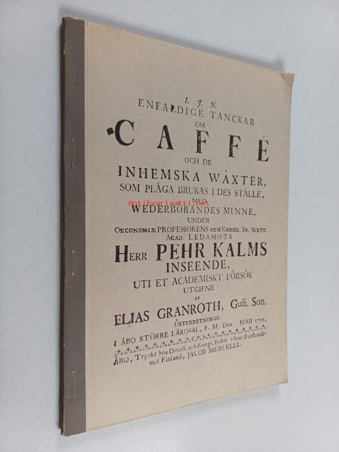 Muu(t) tekijä(t): Einari Kaskimies, Pehr KalmMerkinnät: omistajamerkintäAlkuteos: Enfaldige tanckar om caffe och de inhemska wäxter, som plåga brukas i des ställe, ..Asiasanat: kahvi