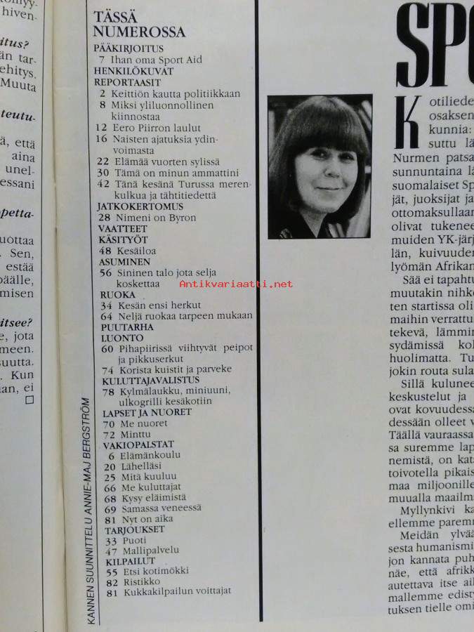 Ilmestynyt 6.6.1986,96s., sisällysluettelo kuvassa,mm. Kaisa Raatikainen, keittiön kautta politiikkaan,Miksi yliluonnollinen kiinnostaa, Eero Piirto