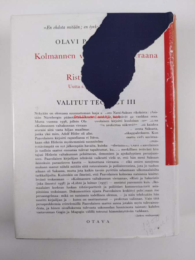 Hyvä. Tarkempi kuntoluokka: K3+ ; Hieman käytön jälkeä kansissa, selkämyksessä aavistus vinoutta. Kansipaperin kunto: repeämiä/kulumaa