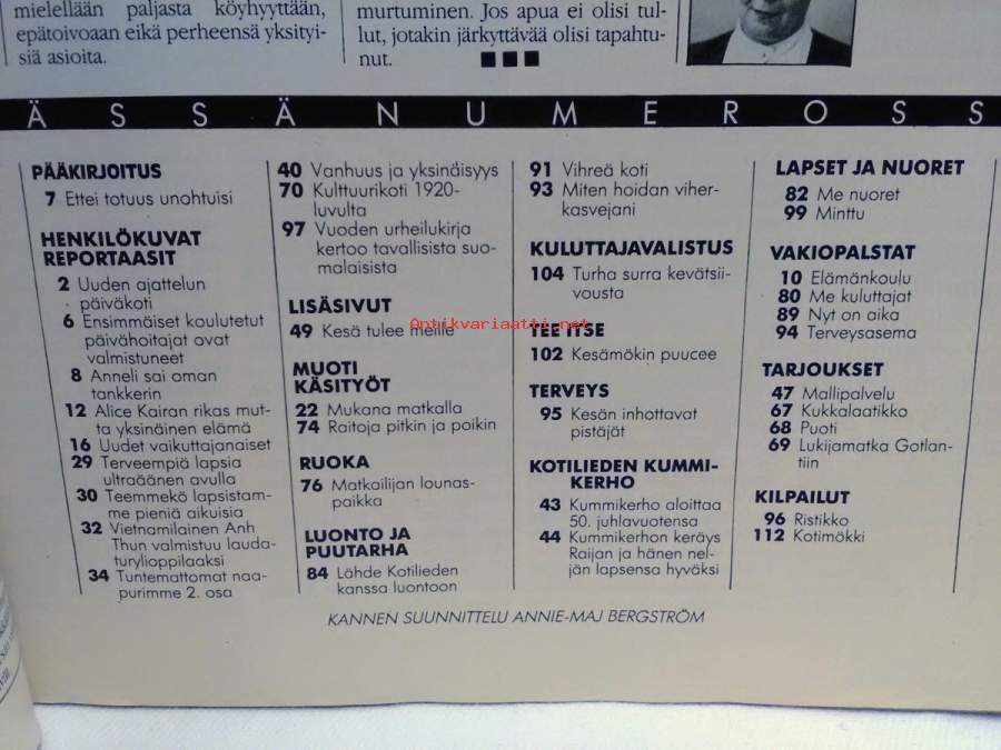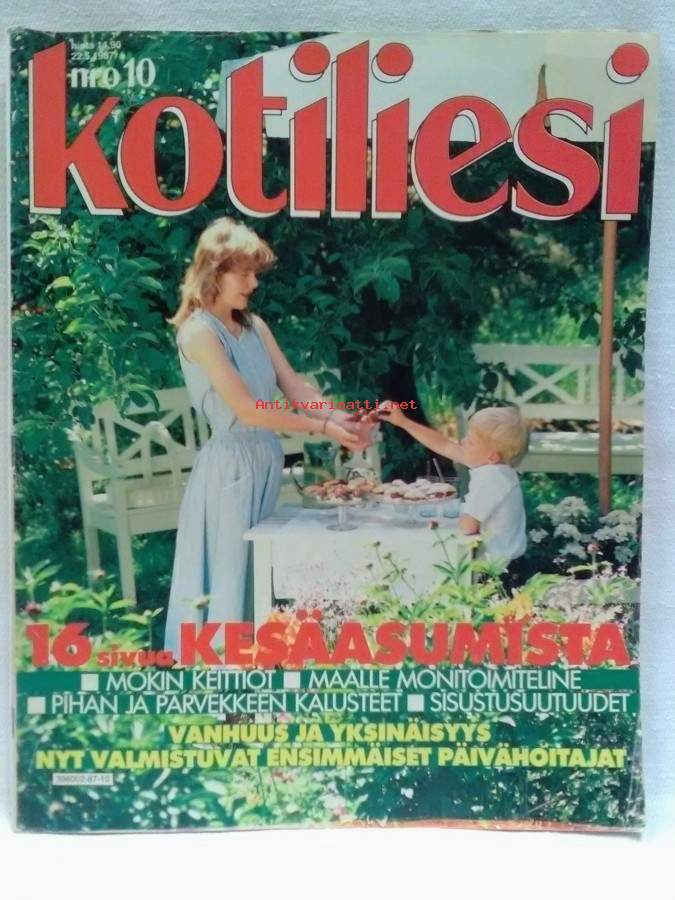 lehti,Ilmestynyt 22.5.1987,112s., sisällysluettelo kuvassa,sisällys mm. Päiväkoti Ravuri Vantaa Hakunila,Merikapteeni Anneli Paavola tankkialus Fannyn päällikkö,Ritva Tienari Oulu kaupungin kulttuuritoimen johtaja, Taidemaalari Alice Kaira: rikas mutta yksinäinen maailma, Ylioppilas Anh Thu Tran Minh: olen sopusoinnussa pakolaisuuteni kanssa, Koristetaiteilija Alma Tähtinen Helsinki 87v. ,Kesämökkisivut ,Annikki Setälä ja Jarl Sundqvist Rovaniemi, kulttuurikoti 1920-luvulla ,Minttu sarjakuva ,Tee itse Kesämökin puucee