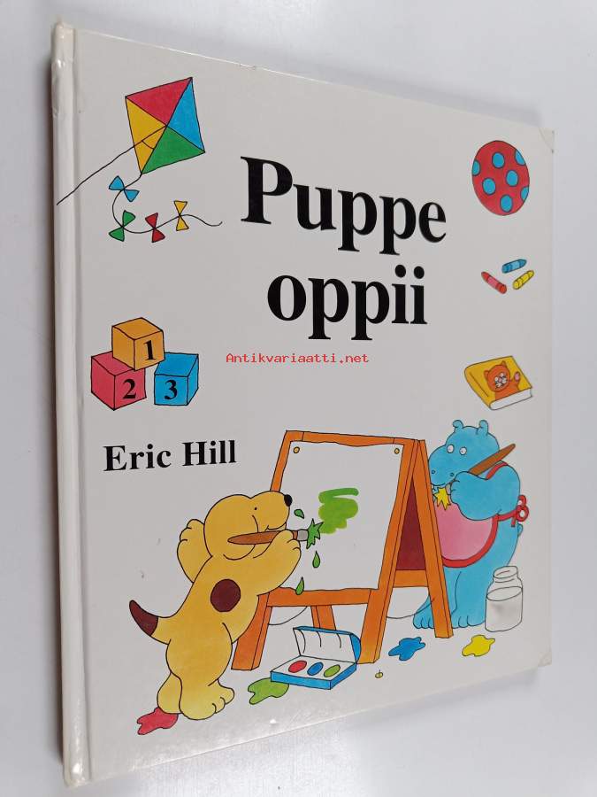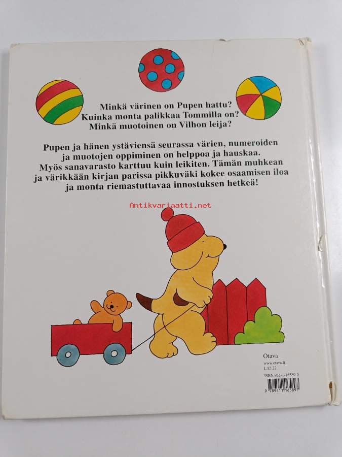 yhteisnide sisältää teokset Puppe oppii värejä, muotoja ja numeroita sekä Puppe oppii sanoja, yhdellä sivulla aivan pienoista tahraisuutta