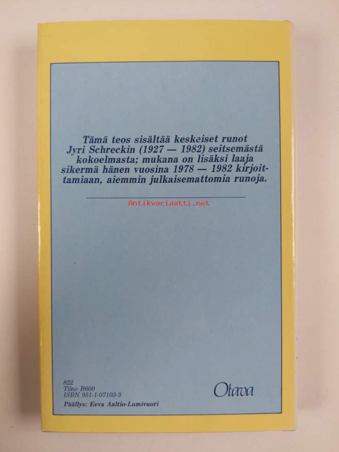 Hyvä. Pienoista nuhruisuutta, pienoista kulumaa, aivan pienoista tahraisuutta kansissa, selkämyksessä hieman vinoutta. Kansipaperin kunto: kulumaa/pienehköjä repeämiä & tahraisuutta
